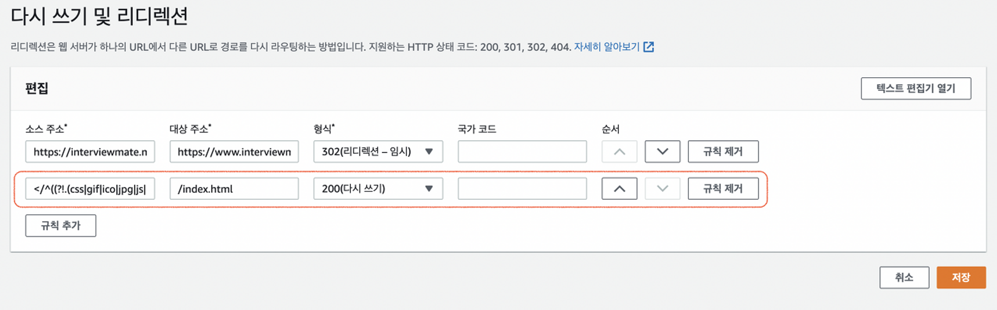 위와 같은 문구를 리디렉션 규칙에 추가 하는 것으로 문제를 해결하였습니다.